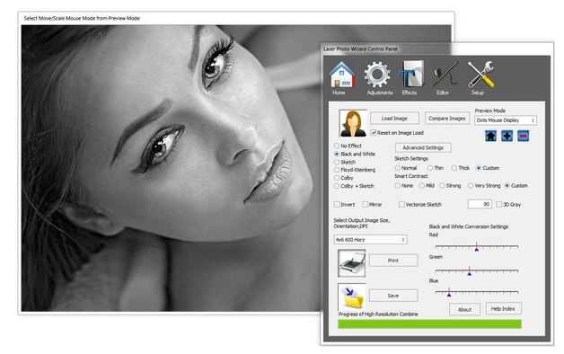Laser Photo Wizard Professional is a powerful software that converts photos to grayscale black and white images for laser engraving. It offers three methods to achieve this: Edge Sketching, which creates a sketch of the image based on its edges; Dithering, which uses a series of black and white dots to preserve the gray value in an area; and Combined Dithering with Sketch, which increases contrast and considers edges.