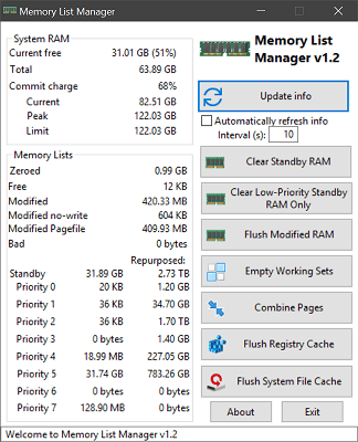 Memory List Manager is a small, lightweight utility to clear standby memory and flush caches, without needing to load a full heavyweight system resources app like SystemInformer, the code for which this project is based on. Windows keeps memory contents it thinks you might use again soon loaded and marked as standby, theoretically this memory is 'available' but memory management isn't always perfect, and high persistent standby and especially modified memory can cause reduced system performance, certain issues with some memory intensive apps or even lead to spurious out of memory errors and system destabilization.