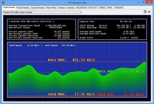 For a selected network adapter, TCP Monitor Plus can retrieve real-time information regarding data traffic, as well as sent and received packets, displaying a graphical representation of the transfer speed, with minimum and maximum values marked down.
