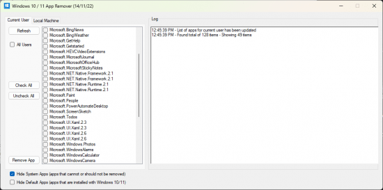 Allows you to easily remove apps from Windows 10/11 - with this program you can hide all system apps and then remove all other apps in one step either for current user, all users or the local machine (so they don't then reinstall automatically for new users). This was written to speed up the process of removing unwanted apps when setting up new computers as they often come with lots of additional bloatware that is not required.